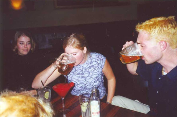 Right after this photo, Melissa, the 21st birthday girl, smashes down her glass right on top of the strawberry daquiri, shattering the glass and creating a landslide red slush.
