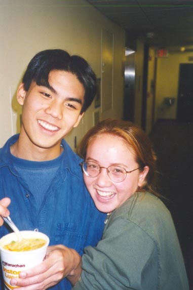 Andrea sneaks in with a hug as she prepares to snake Jim's Cup A Noodles.